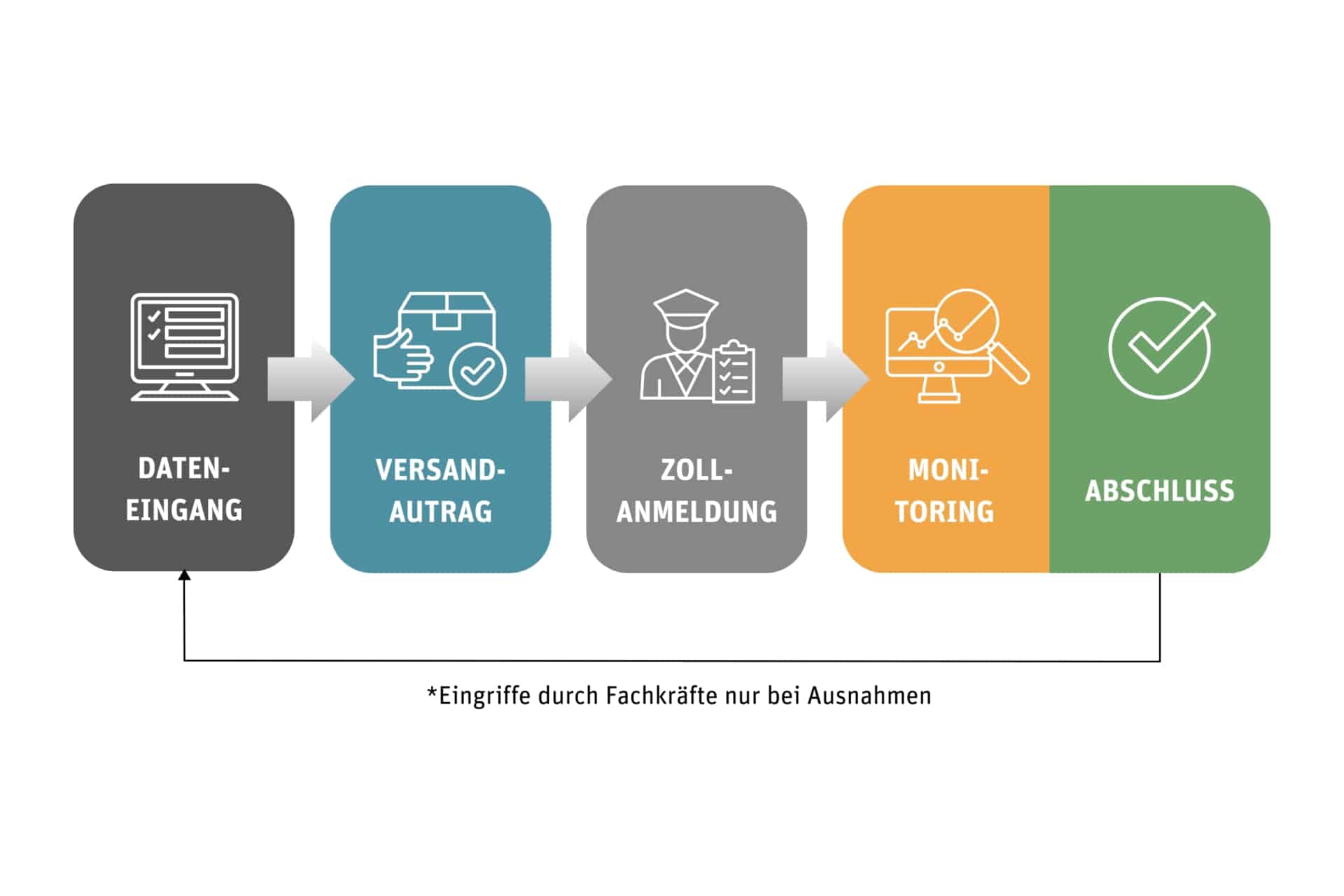 Ein anschauliches Beispiel sind gleichartige Exportsendungen in Drittländer. Während früher jede Sendung einzeln angelegt werden musste, kann ein definierter Workflow heute automatisch Versandaufträge erstellen, Zollanmeldungen einleiten und Rückmeldungen ins System einspielen. Eingriffe durch Mitarbeitende sind nur noch bei Ausnahmen erforderlich.